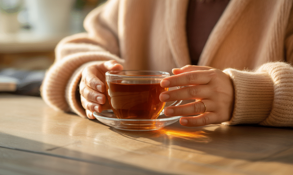 Mach dir eine Tasse mit einem warmen Getränk – aber diesmal bewusst. Hör, wie das Wasser kocht oder die Maschine arbeitet, riech den Dampf oder den Duft, spür die Wärme der Tasse in deinen Händen. Trink langsam. Das ist kein Getränk – das ist ein Ritual der Rückkehr zu dir.